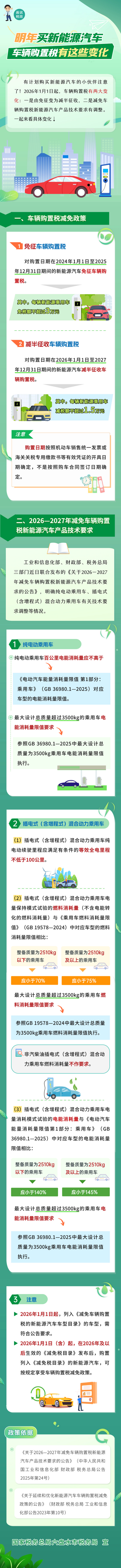 有計劃購買新能源汽車的小伙伴注意了!2026年1月1日起,車輛購置稅有兩大變化:一是由免征變為減半征收,二是減免車輛購置稅的新能源汽車產品技術要求有調整。 一圖帶您看具體變化↓ (圖/文 國家稅務總局六盤水市稅務局)…[詳細]