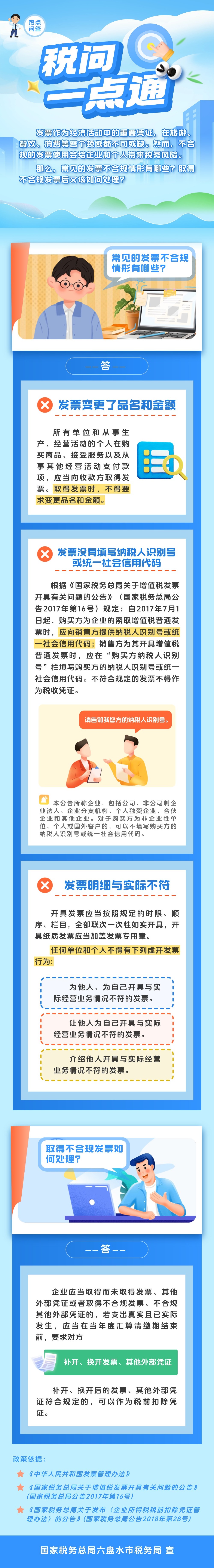 發票作為經濟活動中的重要憑證,在旅游、餐飲、消費等各個領域都不可或缺,不合規的發票使用會給企業和個人帶來稅務風險。那么,常見的發票不合規情形有哪些?取得不合規發票后又該如何處理?下圖為您答疑解惑! (圖文來源/國家稅務總局六盤水市稅務局)…[詳細]
