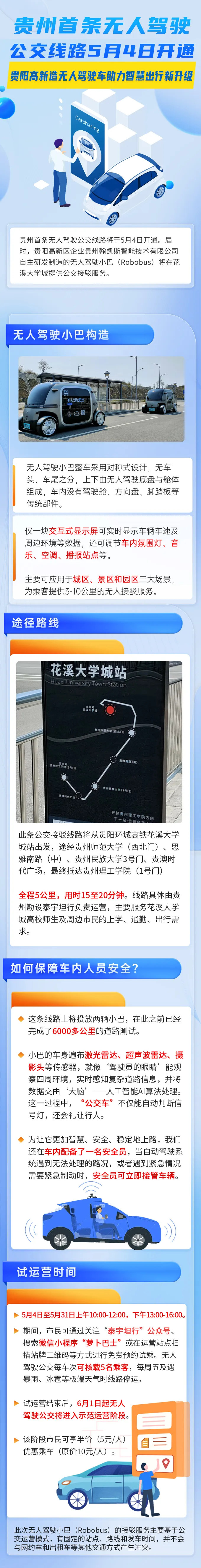 4月24日,筆者從貴陽高新區企業貴州勘設泰宇坦行科技有限公司(下稱貴州勘設泰宇坦行)獲悉,全省首條無人駕駛公交線路將于5月4日開通。屆時,由高新區企業貴州翰凱斯智能技術有限公司自主研發制造的無人駕駛小巴(Robobus)將在花溪大學城提供公交接駁服務。 無人駕駛小巴整車采用對稱式設計,無車頭、車尾之…[詳細]