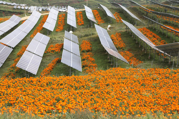 在威寧仙水窩區域樂利農業光伏電站,1000多畝萬壽菊競相開放,藍色的光伏板與黃色的萬壽菊交織成一片美麗景色。代波攝