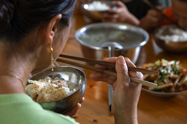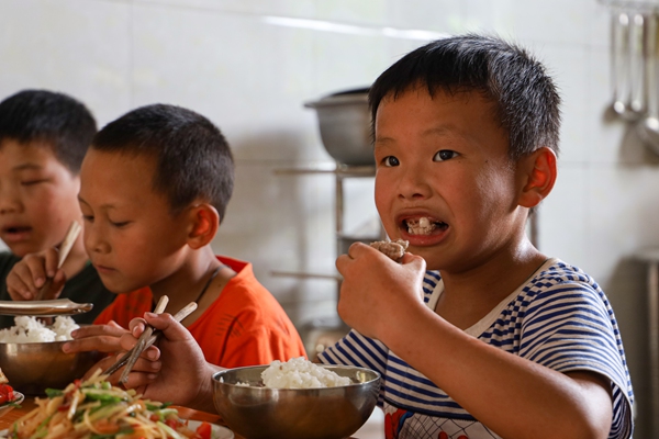 11點30分是午餐時間。下課后,學生們陸續走進食堂,從桌子底下拉出小凳子乖乖坐好。朱木群舀出鍋里最上面的白米飯,添上炒菜一份一份的分發給孩子們。又自然地將鍋底的硬鍋巴舀到自己的碗里,澆上素湯,待鍋巴飯泡軟后,與孩子們一起有說有笑的吃著。