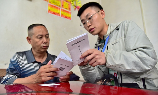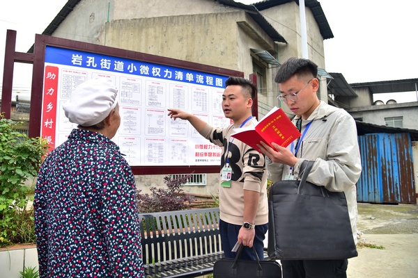 圖為片區特崗民生監督員正在向群眾發放“廉心卡”。潘 磊攝