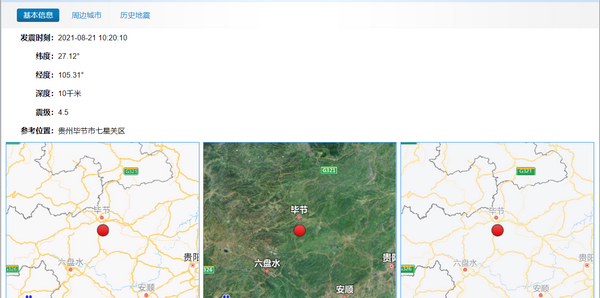 中國地震臺網正式測定:08月21日10時20分,在貴州畢節市七星關區(北緯27.12度,東經105.31度)發生4.5級地震,震源深度10公里。