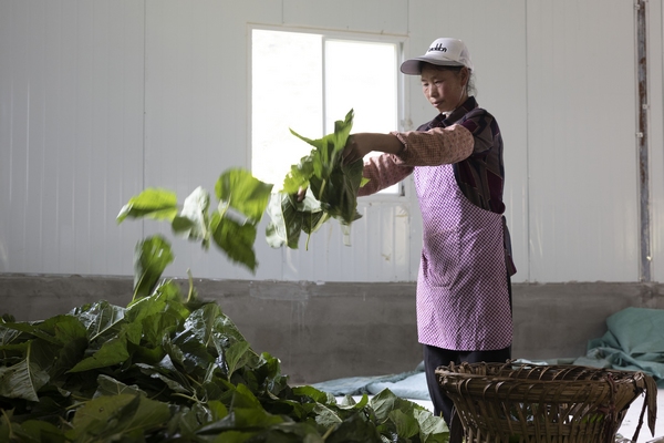 9月1日,貴州省納雍縣豬場鄉樂咪營村桑蠶養殖房內,村民正在認真分揀桑葉。