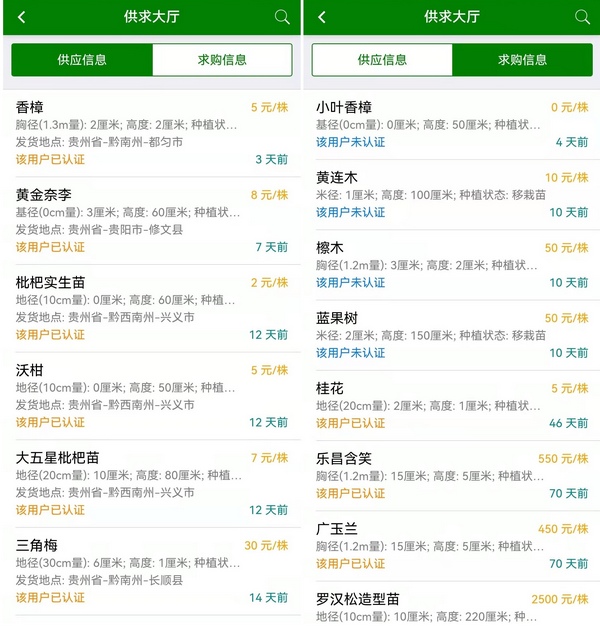 在供求板塊中,所有供應信息、求購信息列表在這里進行綜合展示,可查看供應及求購的詳細信息,包含苗圃名稱、聯系電話等。在這塊欄目,生產經營者不僅可以一鍵查詢各種林木種苗的詳細信息和數據,還可以及時發布種苗供應信息和求購信息,讓種苗生產者、經營者和使用者獲得及時溝通,及時掌握林木種苗供求信息,了解苗木花卉市場動態,掌握苗木花卉產業發展方向,進而做好種苗調劑和經營工作。