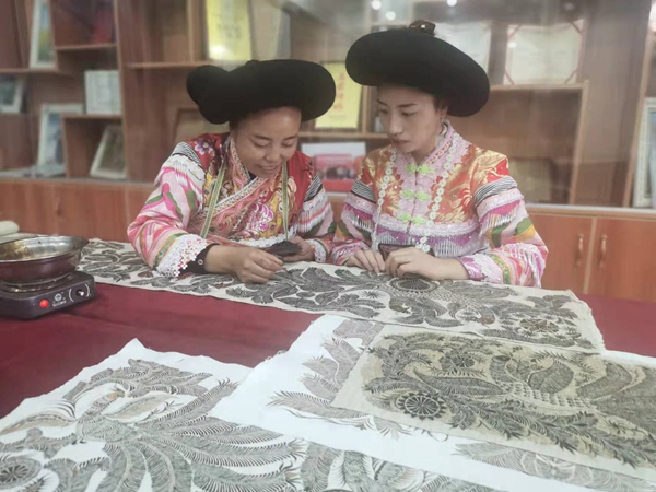 楊麗(左一)在傳承蠟染技藝。晏夢景攝