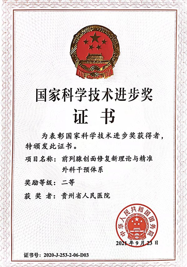 在11月3日召開的2020年度國家科學技術獎勵大會上,由上海市第一人民醫院、南方醫科大學珠江醫院、貴州省人民醫院共同開展《前列腺創面修復新理論與精準外科干預體系》項目榮獲國家科學技術進步獎二等獎,填補了貴州省人民醫院國家級科技獎勵的空白。