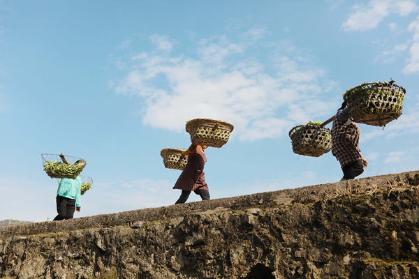 貴州省黔南布依族苗族自治州三都水族自治縣大河鎮仙橋村甲照大寨村民搬運菜薹。