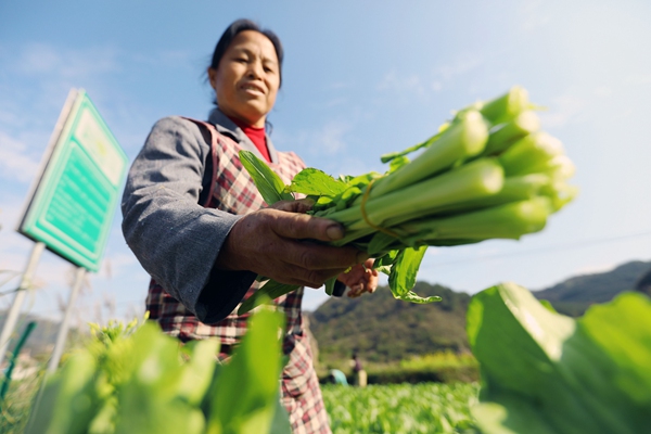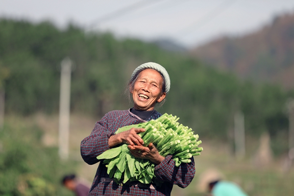 貴州省黔南布依族苗族自治州三都水族自治縣大河鎮仙橋村甲照大寨村民在田間采摘菜薹。