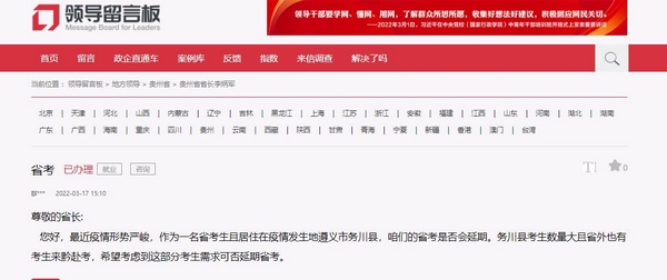3月12日,務川自治縣發現一例輸入性新冠肺炎確診病例,截至3月17日18時,疫情已累計報告9例感染者,涉及5個家庭。3月14日起,務川對全縣各鄉鎮、街道、社區行政轄區范圍的交通等進行管控,后續管控措施將視疫情防控情況及時調整。受該輪疫情影響,多名將在近期參加貴州省考的考生在人民網“領導留言板”向貴州省長留言。