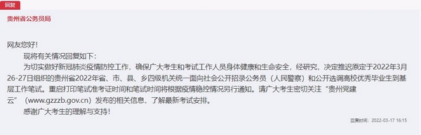 對上述相關留言,貴州省于3月17日對相關留言進行了統一回復。貴州省公務員局對網友表示:為切實做好新冠肺炎疫情防控工作,確保廣大考生和考試工作人員身體健康和生命安全,經研究,決定推遲原定于2022年3月26-27日組織的貴州省2022年省、市、縣、鄉四級機關統一面向社會公開招錄公務員(人民警察)和公開選調高校優秀畢業生到基層工作筆試。重啟打印筆試準考證時間和筆試時間將根據疫情穩控情況另行通知。請廣大考生密切關注“貴州黨建云”(www.gzzzb.gov.cn)發布的相關信息,了解最新考試安排。