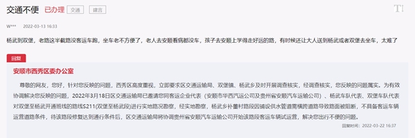 人民網貴陽3月24日電(王秀芳) 3月22日,貴州安順市西秀區一名網友在人民網“領導留言板”反映鄉鎮間缺乏公共交通、出行不便的留言獲辦理。