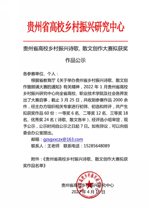 “貴州省高校鄉村振興詩歌、散文創作大賽”由貴州省教育廳主辦,貴州省高校鄉村振興研究中心、貴州省高校鄉村振興協同創新中心承辦,面向全省開展,鼓勵廣大師生用詩歌、散文、朗誦等藝術形式記錄我省鄉村振興貴州做法、貴州經驗,傾情抒寫新時代鄉村振興干部的擔重任、創振興之歷史華章。