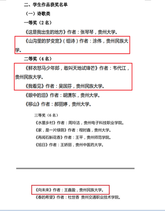 近日,貴州省高校鄉村振興研究中心對“貴州省高校鄉村振興詩歌、散文創作大賽”獲獎作品進行公示。貴州民族大學學子的作品榮獲多個獎項。其中,涂偉榮獲詩歌類一等獎,韋代江、吳國芬榮獲詩歌類二等獎,王鑫盈榮獲詩歌類三等獎,賀冰冰、安思釔、張偉、何皎榮獲詩歌類優秀獎,張語涵榮獲散文類優秀獎。