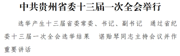 記者從4月28日下午召開的中共貴州省委新聞發布會上獲悉,4月28日下午,中國共產黨貴州省第十三屆委員會第一次全體會議在貴陽舉行。諶貽琴同志主持會議。