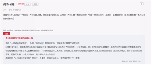 收到留言后,清鎮市消防大隊防火監督員對該小區消防安全問題進行了實地檢查。經查,該網友反映問題屬實。清鎮市消防大隊防火監督員對永和安物業管理有限公司下達了立即整改通知書,并對該問題進行立案調查。同時,要求永和安物業管理公司管理人員提高消防安全知識,提高防火意識,做好日常消防安全管理,配備滅火器,杜絕火災隱患,履行消防安全主體責任。