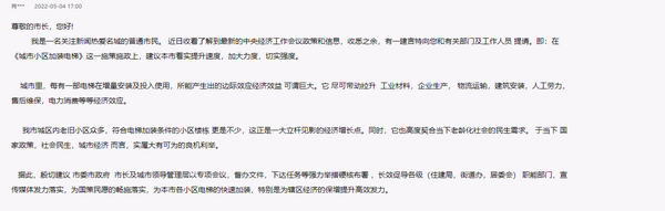 該網友在留言中說,自己是一名喜歡關注新聞,且熱愛家鄉的普通市民。近期了解到各級各部門鼓勵老舊小區加裝電梯的相關信息、政策后,便特地上網留言,建議遵義提升速度、加大力度,推進老舊小區加裝電梯工作。