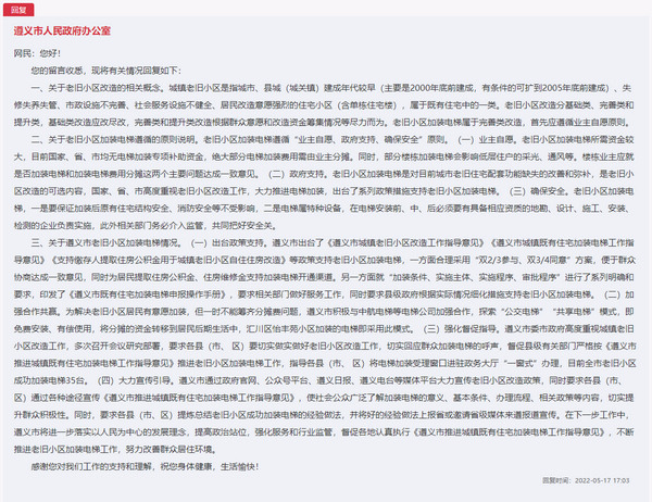 這條留言很快被相關部門注意到。遵義市人民政府辦公室從“老舊小區改造的相關概念”“老舊小區加裝電梯遵循的原則”“遵義市老舊小區加裝電梯情況”三個方面,對網友的建議進行了詳細回復。