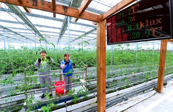 貴澳農旅產業示范園大數據與農業經濟深度融合。圖為工人在生態高效蔬果采摘體驗館為水果西紅柿授粉。陳慧攝