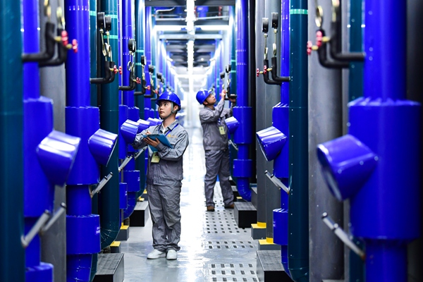 中國聯通貴安云數據中心技術人員在機房室內巡檢微模塊進出水管閥門壓力表。圖為中國聯通在南方建設的最大云數據中心。陳慧攝