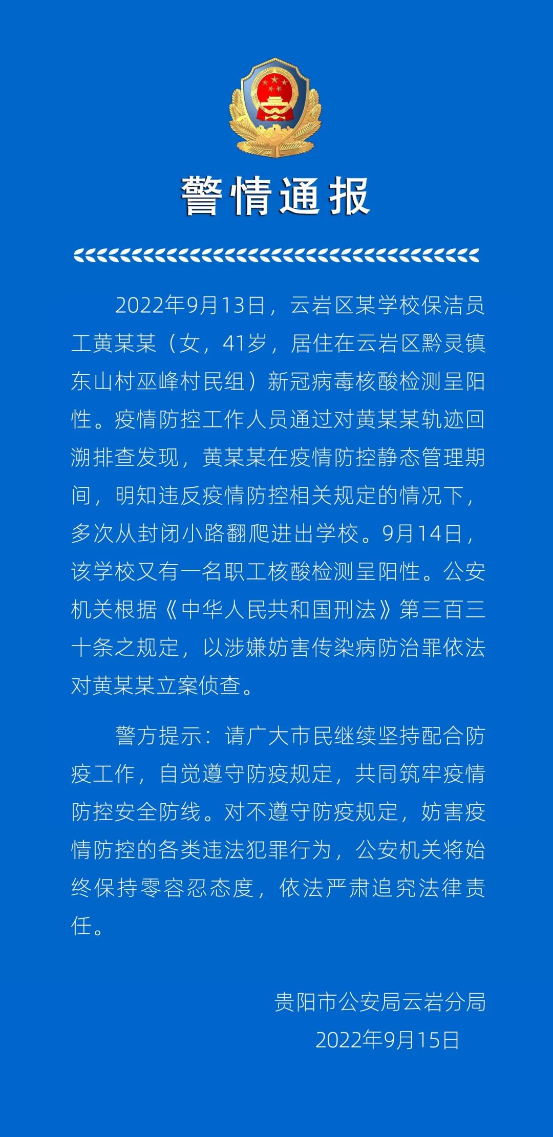 今天(9月15日),貴陽公安云巖分局發布一則警情通報,全文如下: