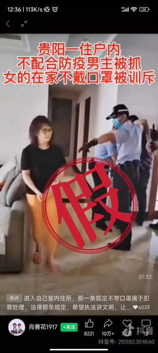 近日,一段公安民警上門抓人的視頻在朋友圈流傳,視頻中,幾名民警在居民家中對違法者進行搜身。作者還在視頻中打出“貴陽一住戶內不配合防疫,男主被抓,女的在家里不戴口罩被訓斥”等醒目字樣,引發網友的關注和轉發。