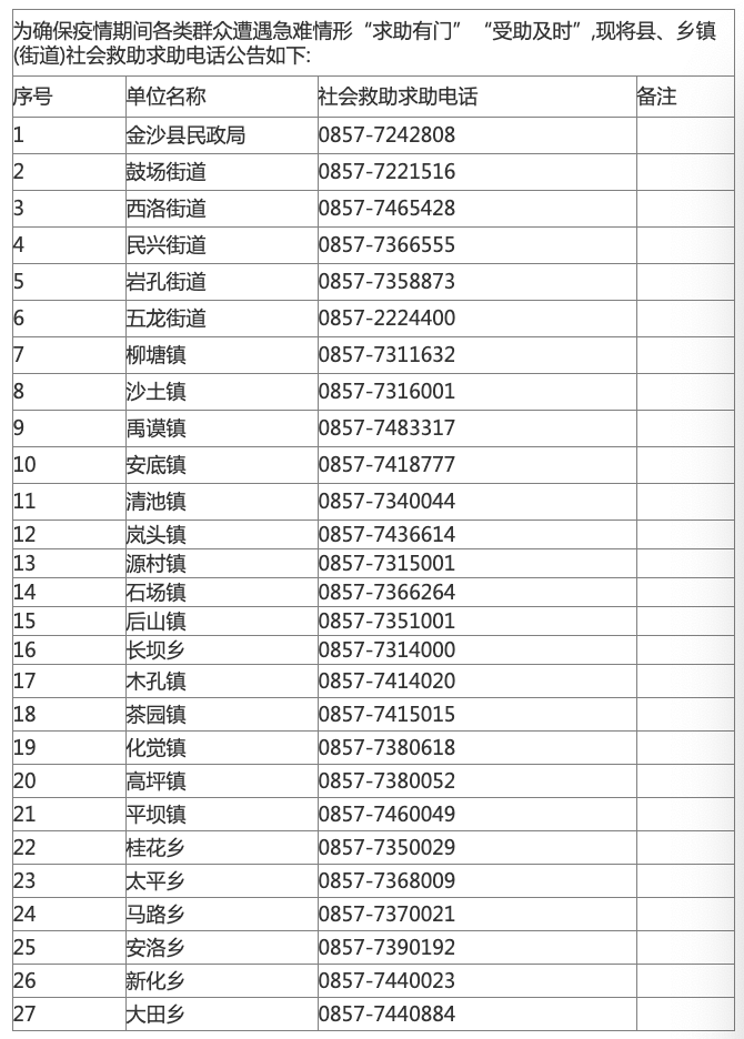 畢節七星關區、納雍縣、金沙縣疫情期間社會救助求助電話公示