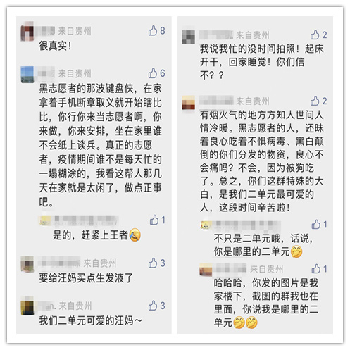 自本輪貴陽疫情發生后,類似謠言屢有發生,如網友未經仔細辨別和求證就進行轉發傳播,不僅會導致以訛傳訛,助長謠言,也會寒了一線抗疫志愿者的心。對此,網友“貴州娛樂貓”表示:“越看越生氣”。他在自己的微信公眾號平臺發文稱:很多志愿者是真的很辛苦,男的好一點,女生經常被情緒失控的業主懟哭?!斑€有人黑志愿者,說利用克扣妹子的物資來要挾妹子。我就想問問,負責分發統計的副組長會看不到?負責敲門的會看不到?”不少網友點贊了他的這條微信推文,并在評論區留言支持。