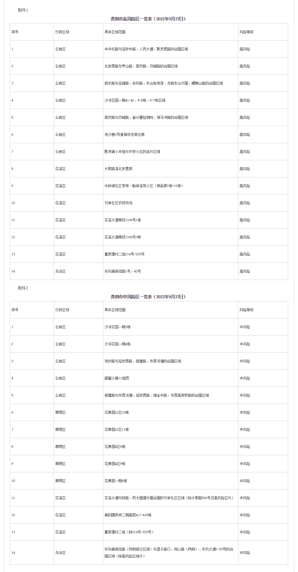 1.貴陽市高風險區一覽表(2022年9月27日)
