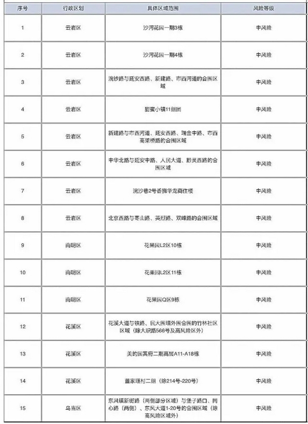 根據當前疫情防控形勢,為快速有效阻斷疫情傳播,實現科學精準防控,切實保障轄區內群眾生命安全和身體健康,逐步有序恢復正常生產生活秩序,按照《新型冠狀病毒肺炎防控方案(第九版)》《貴陽市高風險區疫情防控攻堅指導方案》相關要求,經專家組研判,自9月28日0時起,將南明區、云巖區中高風險區調整如下: