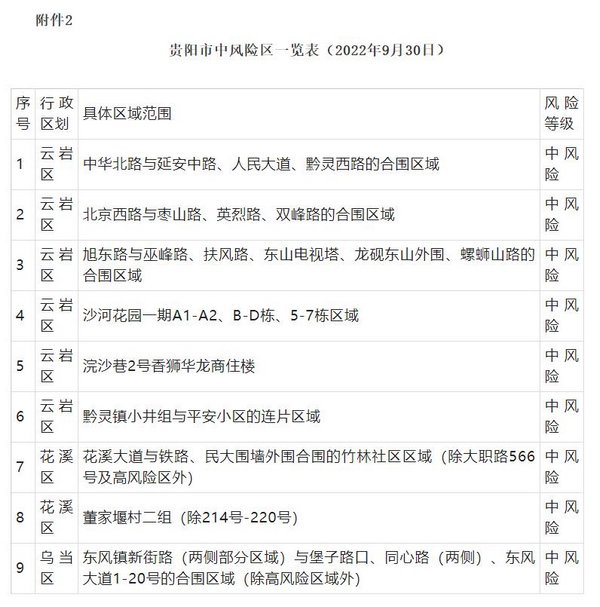 2.貴陽市中風險區一覽表(2022年9月30日)