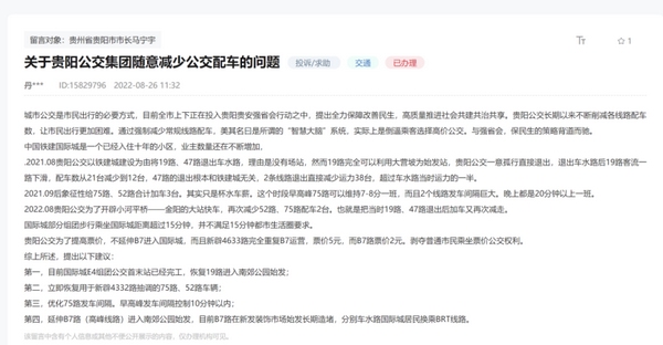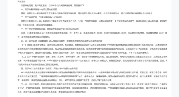 急難愁盼 | 貴州貴陽一網友反映公交運營問題獲列清單回復辦理