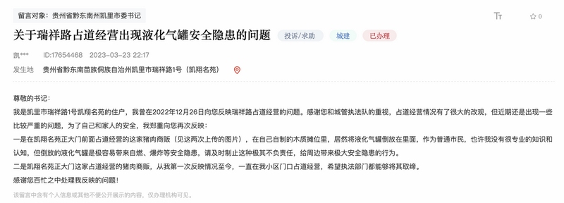 該留言網友是凱里市瑞祥路1號凱翔名苑的住戶,近期發現在凱翔名苑正大門前有一占道經營的豬肉商戶在其自制的木質攤位內將液化氣罐倒放。于是,該網友于3月23日留言反映該問題。