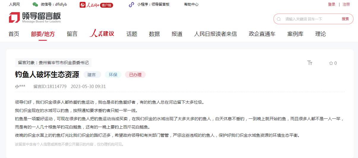 人民網貴陽6月8日電 (李永馨) “希望政府領導和有關部門管管,嚴懲這些違規的釣魚人,保護好我們織金水域的生態環境?!?月30日貴州省織金縣一名網友通過人民網“領導留言板”反映織金縣可垂釣水域存在不文明垂釣現象近日獲回復辦理。