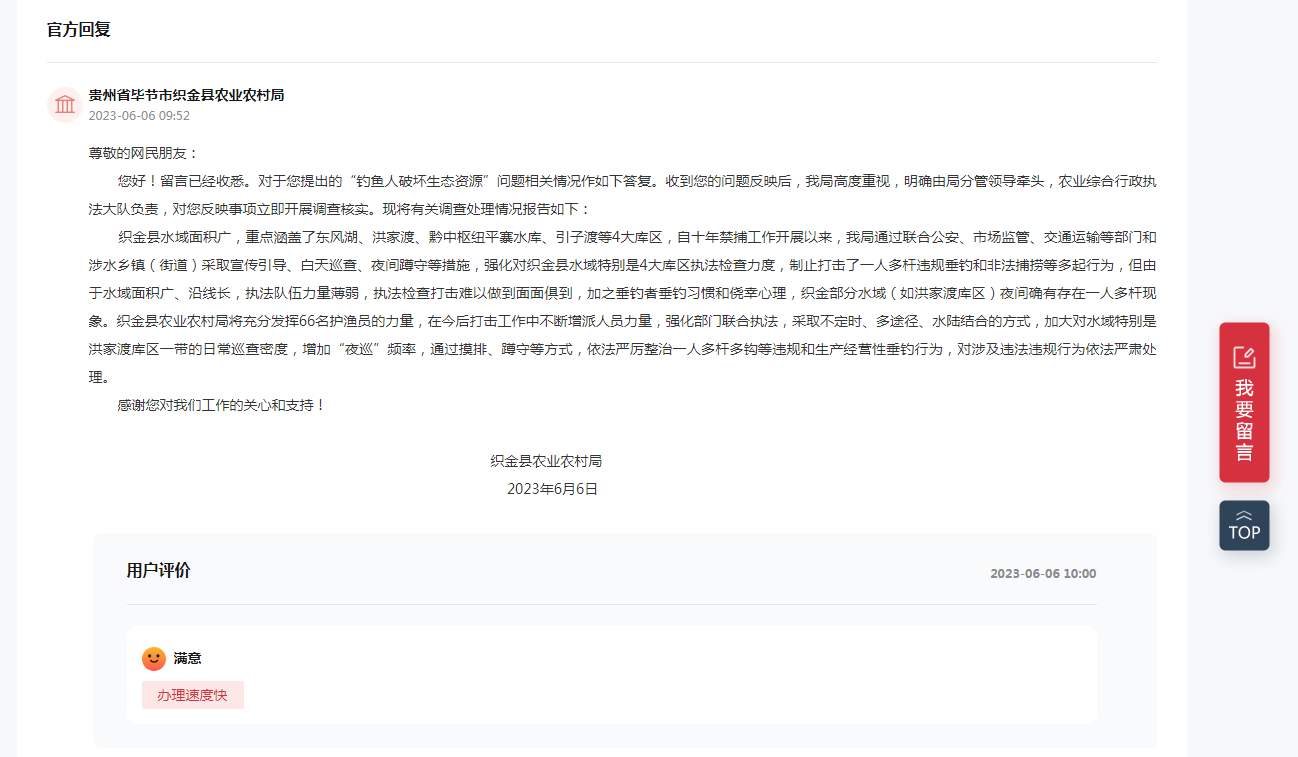收悉該留言后,織金縣農業農村局隨即對“釣魚人破壞生態資源”的相關問題進行了調查處理,并于6月6日作出回復。