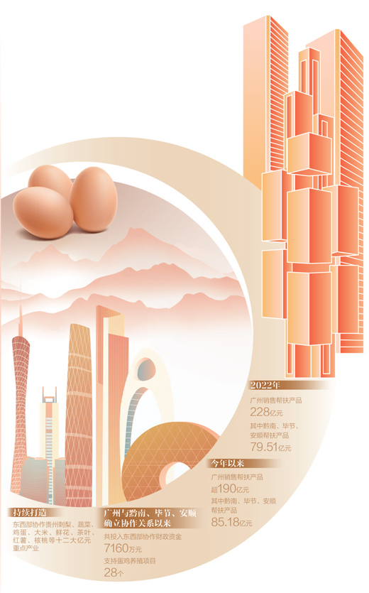 大力實施消費幫扶,是鞏固拓展脫貧攻堅成果同鄉村振興有效銜接的重要舉措。新一輪東西部協作工作開展以來,廣東廣州持續探索消費幫扶長效機制,發揮市場在資源配置中的決定性作用,助力多種貴州特色農產品成功進入大灣區市場。其中,貴州雞蛋目前已占廣州市場份額的1/5,在廣東市場年銷量超10億元。