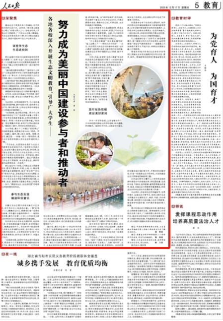 校園是學生學習生活的主要場所,良好的校園生態環境能夠提供學習場域和教育資源,讓學生隨時隨地感受自然的和諧美好,從而逐步樹立起綠色發展理念、生態環保意識。一段時間以來,多地學校積極開展生態校園、美麗校園建設,與生態文明教育相融合。