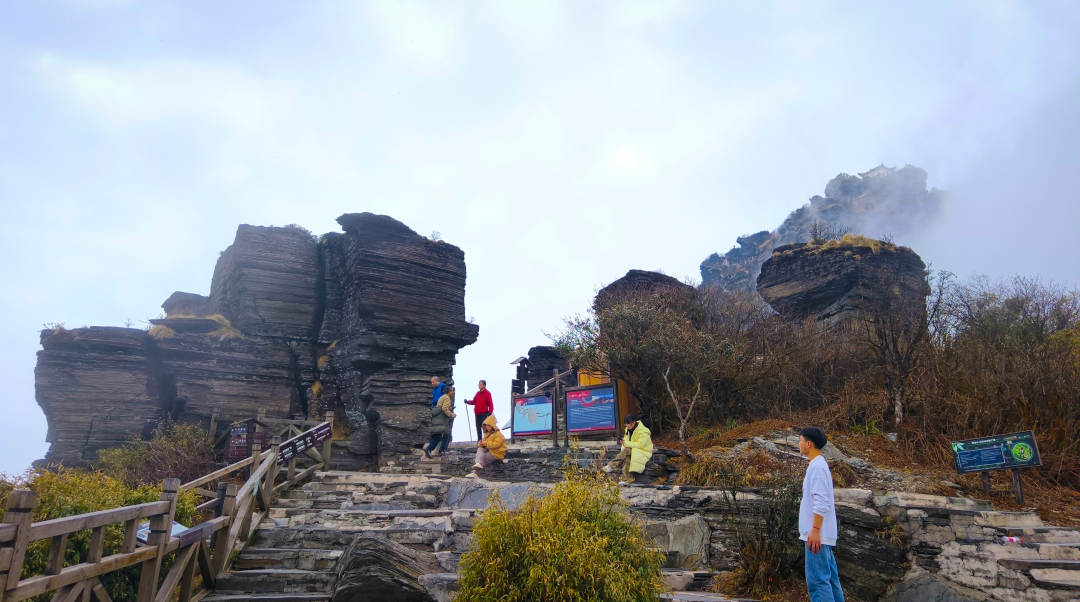 梵凈山景區內孤峰突兀,億萬年的風雨侵蝕,雕琢了老金頂附近的高山石林峰群,諸如“蘑菇石”“老鷹巖”“萬卷書”“將軍頭”等,鬼斧神工,惟妙惟肖,妙趣天成。