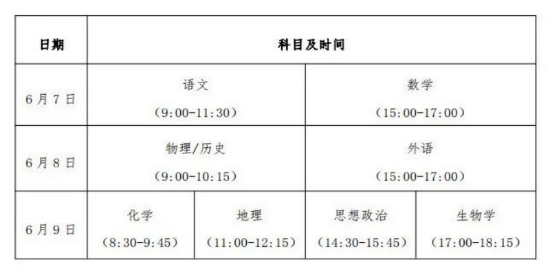 2024年考試時間安排在6月7—9日。語文科目考試時長為150分鐘,數學、外語科目考試時長為120分鐘,選擇性考試科目考試時長均為75分鐘。具體考試時間為: