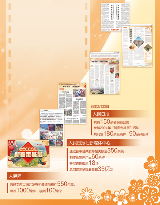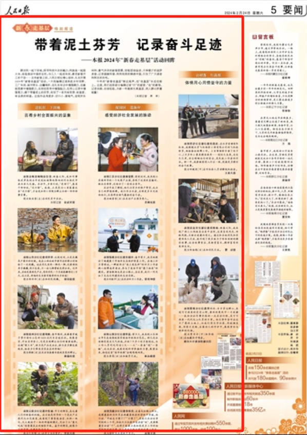 跟農民一起下田地,探尋科技興農的魅力;和旅客一起搭火車,體驗流動中國的生機;與工人一起進車間,感受新春開工的干勁……龍年新春之際,人民日報社精心組織、扎實開展2024年“新春走基層”活動,一大批編輯記者奔赴鄉村田野、工廠車間、城市街頭、邊疆哨所,在扎實采訪中增強腳力,在敏銳觀察中增強眼力,在深刻思考中增強腦力,在用心記錄中增強筆力,腳下帶著泥土的芬芳,采寫了一系列有思想、有溫度、有品質的報道。這些作品角度多、切口小、接地氣,呈現歡樂祥和、喜氣洋洋的新春圖景,定格團結奮進、只爭朝夕的追夢身姿,記錄溫暖和諧、欣欣向榮的錦繡中國,引發了廣大讀者和網友的共鳴。