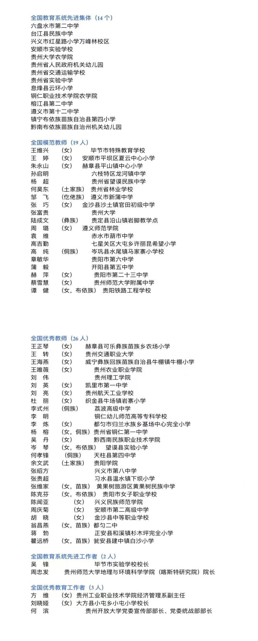 9月8日,慶祝第40個教師節暨全國教育系統先進集體和先進個人表彰活動在北京舉行。貴州14個集體被評為“全國教育系統先進集體”,19人被評為“全國模范教師”,26人被評為“全國優秀教師”,2人被評為“全國教育系統先進工作者”,3人被評為“全國優秀教育工作者”。