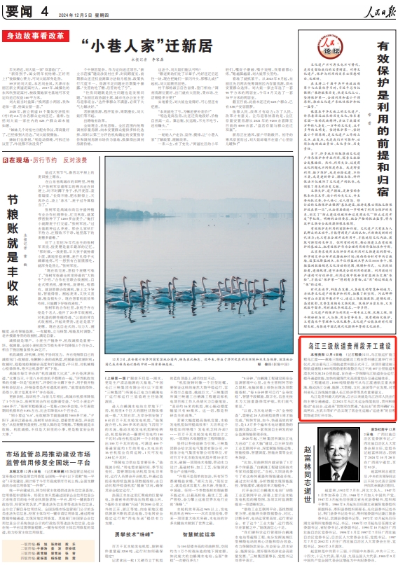 本報貴陽12月4日電 (記者程煥)2日,烏江航運擴能工程烏江渡——龔灘三級航道建設工程在貴州德江港舉行開工儀式,標志著烏江三級航道貴州段正式開工。該項目建設按三級航道通航1000噸級船舶標準整治烏江干流407公里航道和清水河支流24公里航道,旨在進一步保障烏江航道安全運行、提升通道效能,加快構建現代化高質量綜合交通運輸體系。