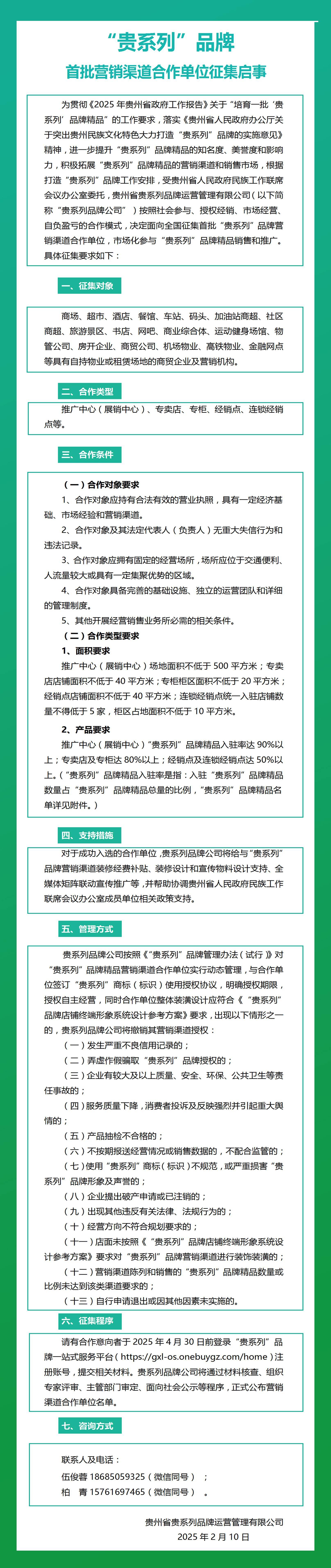 征集程序嚴謹規范,有意向者需在2025年4月30日前登錄“貴系列”品牌一站式服務平臺注冊并提交材料。后續,貴系列品牌公司將通過材料核查、專家評審、主管部門審定及社會公示等環節后,正式發布最終合作單位名單。
