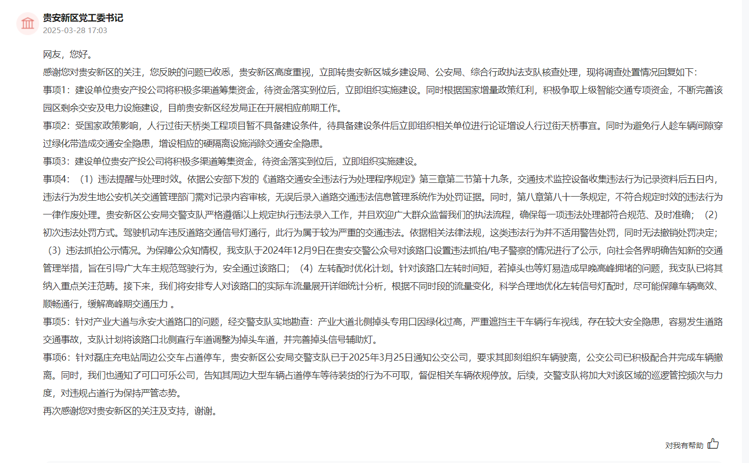 近日,有網友在人民網“領導留言板”上留言,聚焦貴州省貴安新區高端裝備制造產業園區周邊交通問題,從紅綠燈啟用、人行過街設施、斷頭路打通、路口交通組織到占道管理,提出6項具體建議。貴安新區高度重視,迅速組織城鄉建設局、公安局、綜合行政執法支隊等相關部門核查并作出詳細回復。