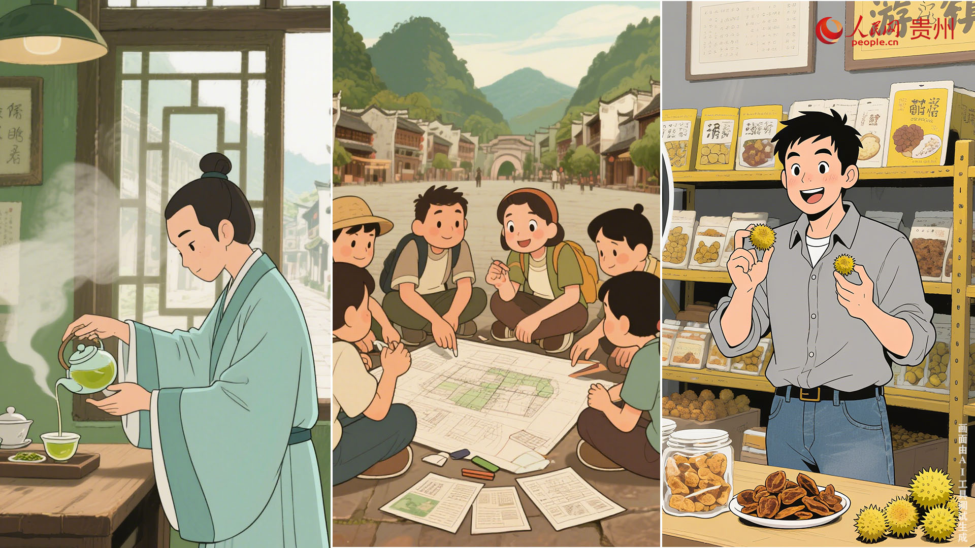 從黃果樹瀑布的銀河傾瀉到甲秀樓前的茶韻悠長,人們在這里找到了 "心之歸處" 的答案 —— 開茶莊、研非遺、直播帶貨,讓綠水青山與金山銀山在這里詩意交融。而在鄉村,越來越多的年輕人開始熱衷于‘村超’和‘村BA’,使這里的土地更具生機與活力。借助AI技術,我們將這些旅居場景凝成幀幀畫卷,邀您跨越時空共赴這場 "追風之旅"。與其等待遠方的召喚,不如即刻啟程,在貴州的山水煙火間,遇見屬于你的第二人生。