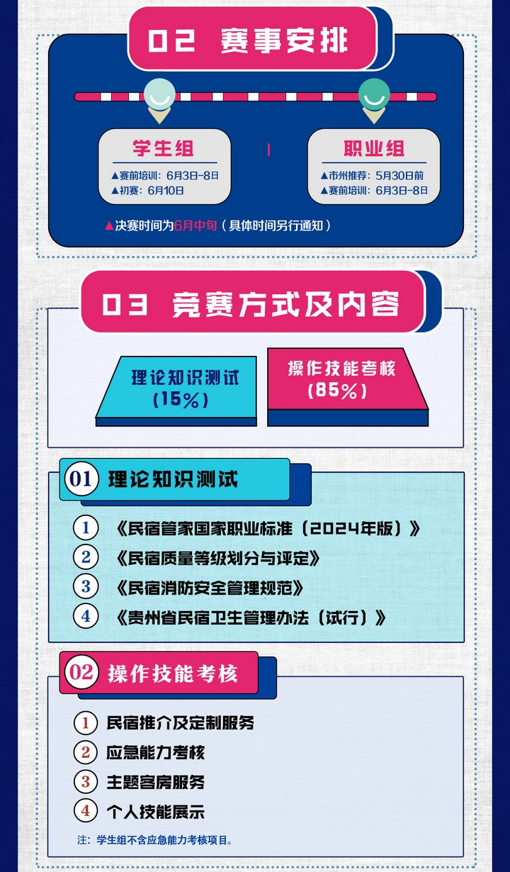 據悉,本次大賽分為職業組和學生組,各組通過舉行初賽,分別選拔54人進入于6月中旬在貴陽職業技術學院舉辦的決賽。在決賽階段,參賽選手將圍繞民宿推介及定制服務、主題客房服務、個人技能展示等競賽內容展開角逐,不同之處在于,職業組聚焦于提升行業從業者的專業技能和服務水平,而學生組則著重于提升實操能力和就業競爭力,以及進一步培養和挖掘民宿行業的新生力量。