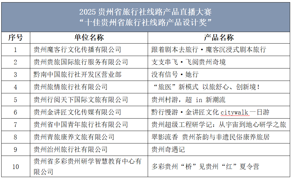 近日,由貴州省文化和旅游廳主辦、貴州省旅行社協會承辦、貴州省旅行社協會新媒體營銷專委會落實執行的“2025貴州省旅行社線路產品直播大賽”評審入圍復決賽名單出爐,專家評委從征集到的130余條線路產品中,評選出“十佳貴州省旅行社線路產品設計獎”,并優選30條線路產品進入線上銷售環節,共同角逐“十佳貴州省旅行社線路產品銷售獎”。