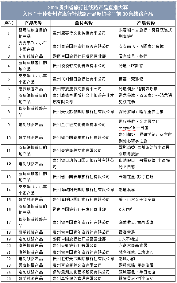 現將入圍“十佳貴州省旅行社線路產品設計獎”“十佳貴州省旅行社線路產品暢銷獎”前30條線路產品名單進行公示,公示時間為2025年8月19日至24日。