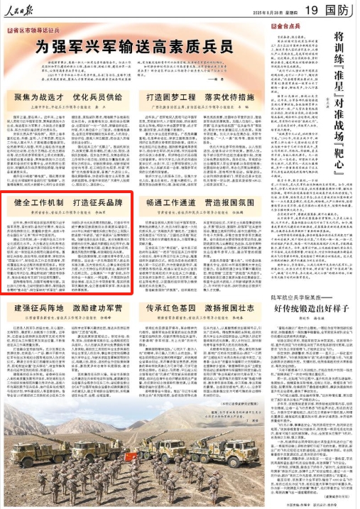 激發政策制度驅動力。制定體檢、政考、定兵、役前教育實施辦法,全流程規范征兵組織。為入伍新兵及家長免費提供專屬人身保險,高級技工類院校畢業生參照高校畢業生享受入伍優待,事業單位定向招聘退役大學畢業生,與新兵家庭簽署解困幫扶協議,構建入役、服役、退役的全方位政策保障體系,激勵更多有志青年長期服役、建功軍營。